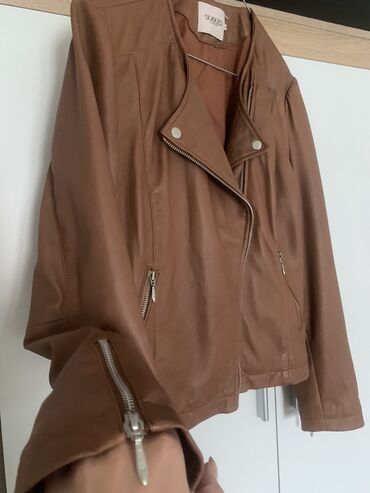 Ženska jakna Sinsay – model biker, veličina M (38). - Boja: svetlo bež - Materijal: mekana brušena tkanina (efekat antilopa) sa glatkom postavom iznutra - Kroj: kratka, strukirana - Ogrlica: širok...