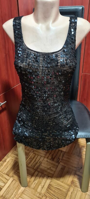 Crna ženska majica na bretele sa ukrštenim trakama oko dekoltea. - Model: uski kroj, dužina do kukova - Izrez: blago zaobljen napred, dekorativne elastične trake formiraju X detalje preko grudnog...