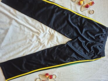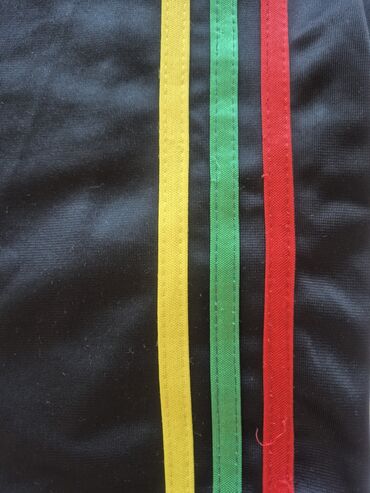 Crne sportske trenerke sa prugama u bojama žuto–zeleno–crveno duž nogavica. Model sa elastičnim pojasom i učkurom iznutra, ravan kroj nogavica. Dva bočna džepa sa rajsferšlusima. Materijal je glatka, lagano sjajna tkanina prijatna za nošenje. Detalji šava i pruga uredno izvedeni (vidljivo na makro fotografijama). Idealan komad za svakodnevno nošenje, sport i ležerne kombinacije.Veličina odgovara xs/S