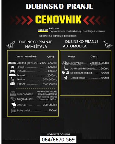 - Dubinsko pranje automobila: komplet sedišta, dečija autosedišta, dečija kolica; ostala vozila po dogovoru