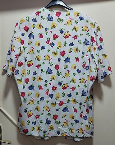 - Gornji sloj: dugi kimono/košulja ravnog kroja, kratki rukavi, otvoren prednji deo bez kopčanja. Baza bela sa raznobojnim cvetnim dezenom (žuta, crvena, plava, zelena).