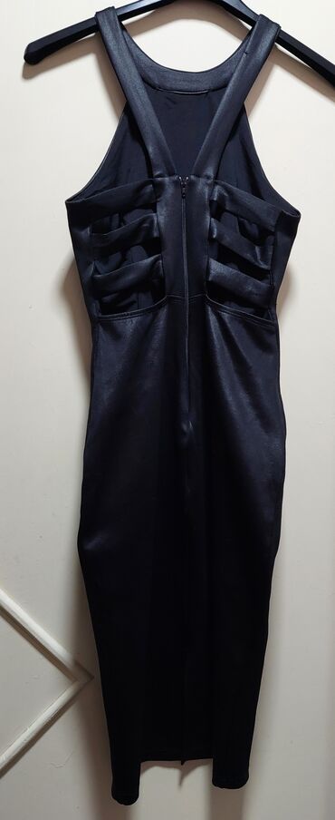 Elegantna crna haljina, midi dužine, uskog kroja koji prati liniju tela. Prednji deo je čist i sofisticiran, sa višim okruglim izrezom i blagim naborima koji daju formu. Leđa su efektna: mreža horizontalnih traka stvara atraktivan “cut-out” izgled, a centralni skriveni rajsferšlus olakšava oblačenje. Ramena su široka i prelaze u sportski/halter stil, dok je materijal gladak sa diskretnim satenskim sjajem. Idealna za večernje prilike, koktel zabave i svečane događaje. Kombinuje se uz štikle i minimalan nakit za maksimalan utisak.dimenzije obim grudi 34 obim kuka 40 duzina 95 pogledajte ostale moje oglase rasprodaja zato su te cene pogledajte ostale moje oglase