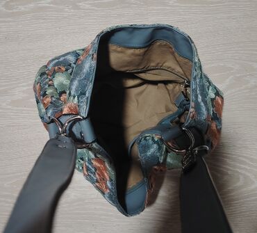 - Materijal: žakard tekstil sa reljefnim cvetnim motivima u nijansama plave, teget, mente i bakarne; detalji od glatke eko kože u plavoj boji (gornji rub, dno i džepovi).
