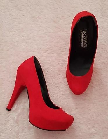 Crvene Rocky salonke sa platformom, idealne za razne prilike. Cipele imaju zaobljen vrh i stabilnu štiklu, pružajući eleganciju i udobnost. Izrađene su od materijala koji podseća na antilop, što im daje sofisticiran izgled. Platforma dodatno doprinosi udobnosti i visini.