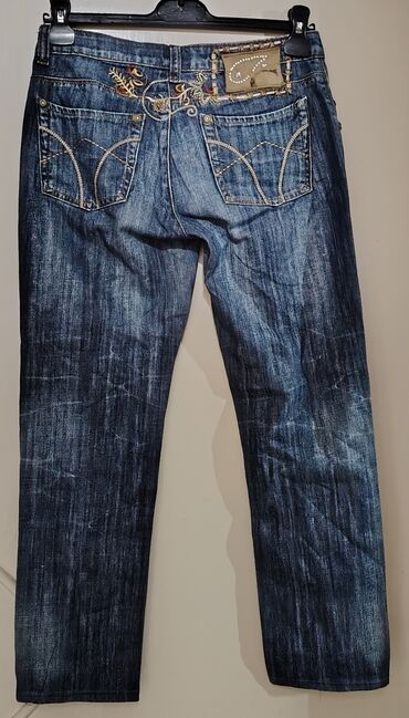 - Na zadnjoj strani: dva džepa sa ukrasnim štepovima i zakovicama, vez oko pojasa i aplikacija sa sjajnim kamenčićima na etiketi