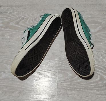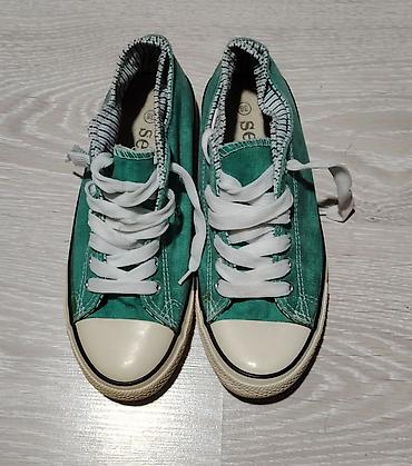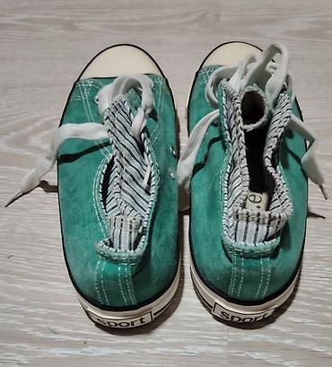 Zelene platnene patike “sport” sa belim gumiranim vrhom i klasičnim pertlanjem. Unutrašnjost je obložena prugastom tekstilnom postavom, a jezik i rub imaju dekorativne štepove. Dva bočna ventilaciona oka sa spoljne strane svake patike. Deblji gumeni đon u bež boji sa crnom linijom, donji sloj je crn sa šarom za dobro prianjanje. Bele pertle, kontrastni štepovi. Na peti je gumena oznaka “sport”. Veličina označena na ulošku: 38. Idealne za svakodnevno nošenje, lagane i udobne.38 gaziste 25 rasprodaja zato su te cene starke su nove pogledajte ostale moje oglase