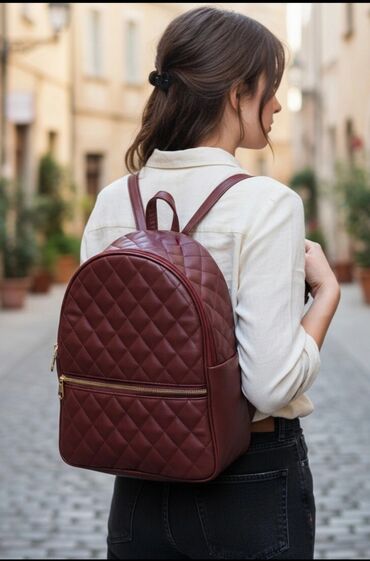 Srednji ranacŽenski ranac – bordo boja, prošiven dijagonalnim štepovima (kvarter-štep), sa zlatnim rajsferšlusima.