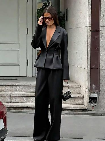 Ženski elegantni komplet odela – sako i pantalonе S M L - Kroj: strukirani sako sa reverima, diskretnim kopčanjem na dugmad i peplum efektom koji naglašava struk; ravne-duže linije rukava. Pantalon...