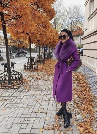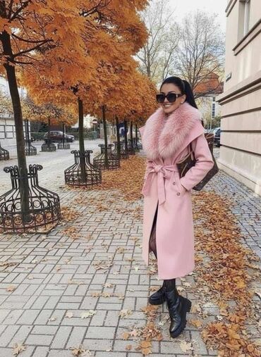 Ženski kaput sa krznom – elegantan dvoredni model - Kroj: dvoredni kaput do iznad kolena, strukiran, sa pojasom za vezivanje i istaknutim ramenima - Ovratnik: bogat rever sa mekanim krznenim okovr...