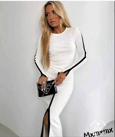 Dvod elni ženski komplet – pletena uska haljina i kratki džemper - Haljina: rebrasti pleteni model, midi dužina, V-izrez, bez rukava, elastična tkanina koja prati liniju tela. - Džemper: crop kroj...