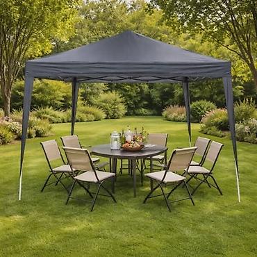Sklopivi paviljon/baštenski šator sa ventilacionim krovom - Dimenzije: 358 x 358 cm (tlocrt) - Visina do krova podesiva: 176–196 cm - Ukupna visina: 264 / 274 / 284 cm (tri nivoa) - Konstrukcija: ...