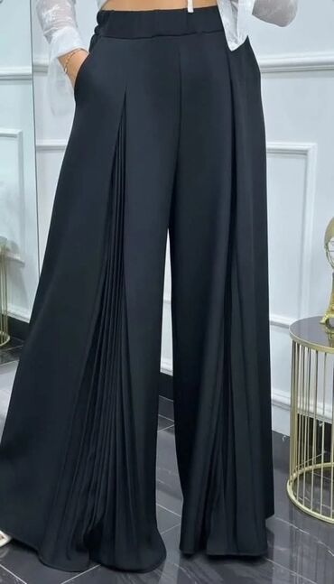 Elegantne široke pantalone – tamnoplava boja - Kroj: široke nogavice (palazzo), visoki struk, duboki nabori sprijeda za lep pad i volumen - Zatvaranje: skriveni rajsferšlus i kopčanje napred (disk...