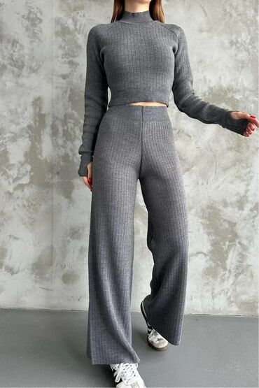 Damski komplet – rebrasti pleteni duks i suknja, crna boja. - Materijal: elastičan, rebrasti plet (prijanja uz telo, udoban za celodnevno nošenje) - Gornji deo: duži duks/bluza sa okruglim izrezom...