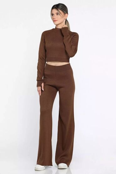 Dvoslojni ženski komplet – rebrasti lounge set - Dvodijelni komplet: kratki top dugih rukava + pantalone sa širokim nogavicama - Rebrasta (riblja kost) tekstura sa rastegljivim vlaknom za udobno p...
