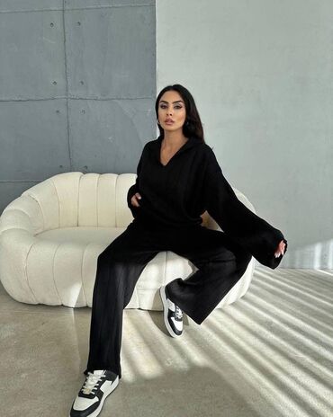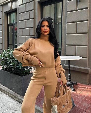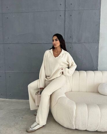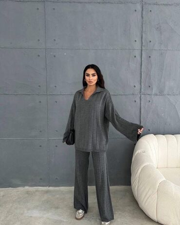 Dvodijelni ženski pleteni komplet – duks i pantalone širokih nogavica. - Materijal: mekani pleteni triko, elastičan i udoban za celodnevno nošenje. - Gornji deo: ravni okrugli izrez, spuštena rame...