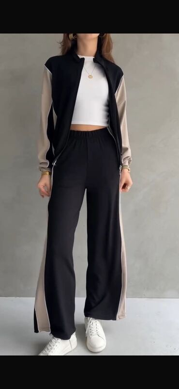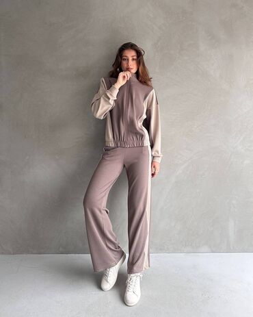 Damski komplet – braon trenerka sa dekorativnim kontrastnim detaljima - Dvodijelni set: gornji deo sa rajsferšlusom + donji deo sa širokim nogavicama - Boja: tamno braon sa bež/ekru kontrastnim tr...