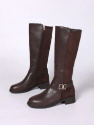 Ženske modne čizme do kolena sa špicastim vrhom i niskom četvrtastom potpeticom. Ključne karakteristike: - Dizajn: široka „slouch/flare“ nogavica koja prekriva deo potpetice, trendi silueta inspir...