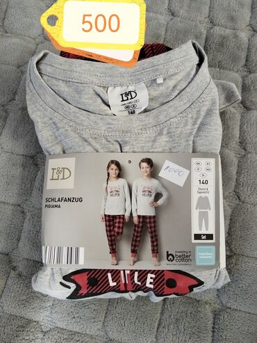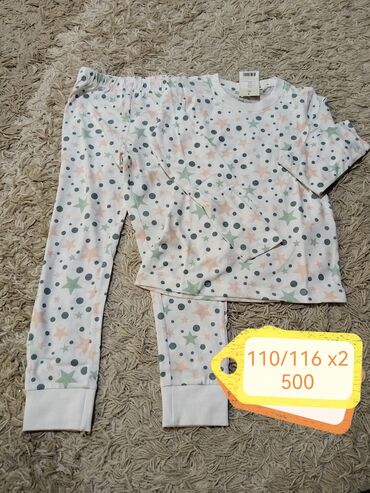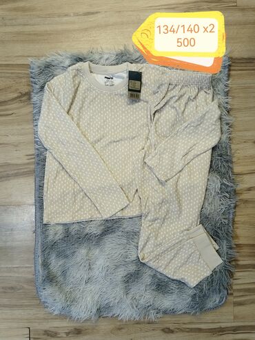 - Bež pidžama sa sitnim belim tufnama. Majica dug rukav i pantalone sa elastičnim pojasom i ranflama na nogavicama. Na etiketi brend pepperts!, veličina 134/140 (dva komada). Cena: 500.