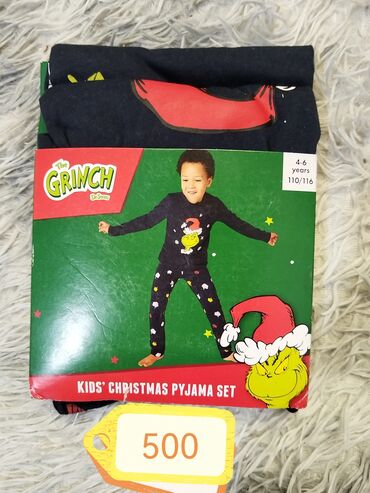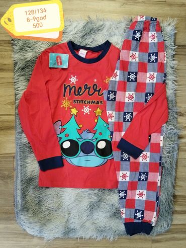 - Crvena božićna pidžama sa likom Stića (Stitch) i natpisom “Merry Stitchmas”. Gornji deo sa dugim rukavima, tamnoplavi ranfli na kragni i rukavima; donji deo karirani u crveno-plavo-belim tonovima sa pahuljama, elastični pojas i ranfle na nogavicama. Veličina: 128/134, uzrast 8–9 god. Cena: 500.