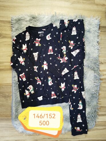 - Tamnoplava pidžama sa zimskim motivima (medvedići, pahulje). Majica dug rukav i pantalone istog dezena sa elastičnim pojasom. Na etiketi brend pepperts! i oznaka 134/140. Istaknuta veličina na slici: 146/152. Cena: 500.