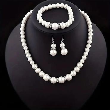 Biserni komplet – ogrlica, narukvica i minđuše - Klasična ogrlica od okruglih svetlucavih bisera u nizu jednake veličine; dužina izgleda duga/operna, pogodna za nošenje u jednom ili više namotaja....