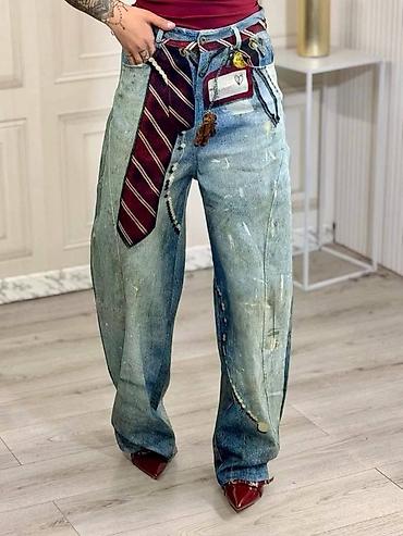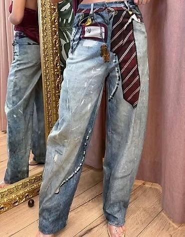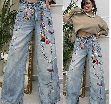 Ženske farmerke širokih nogavica sa ukrasnim nitnama - Model: high-waist, široke nogavice (wide leg) sa ravnim padajućim krojem - Detalji: dve vertikalne trake sa sitnim metalnim nitnama duž spolj...
