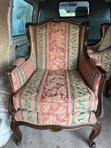 - Konstrukcija od punog drveta tamnog oraha, ručno profilisana sa elegantno talasastim naslonom i izraženim krivinama na nogama (kabriol noge sa volutom).