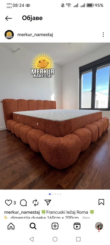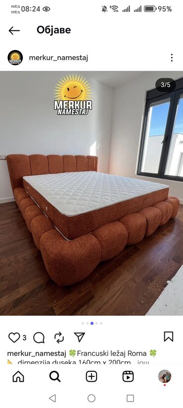 - Tapacirana baza i uzglavlje u toploj terakota/narandžasto-rđastoj tkanini