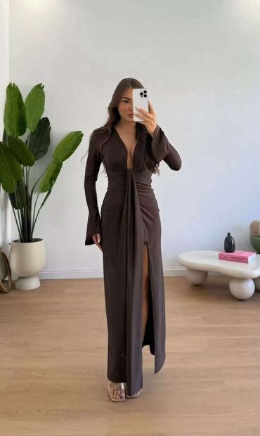 Elegantna tamno braon haljina sa diskretnim svetlucavim efektom. Model sa visokim okovratnikom i dugim rukavima, ukrašen satenskim trakama za vezivanje na rukavima. Struk je naglašen širokim elasti...