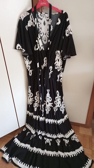 - Maxi haljina sa belim ornamentalnim printom: crna podloga, V-izrez, kratki široki rukavi, podesiv pojas/vez u struku, dugačak, slojevit donji deo sa naborima. Efektan kontrastni dezen u horizontalnim trakama i motivima.