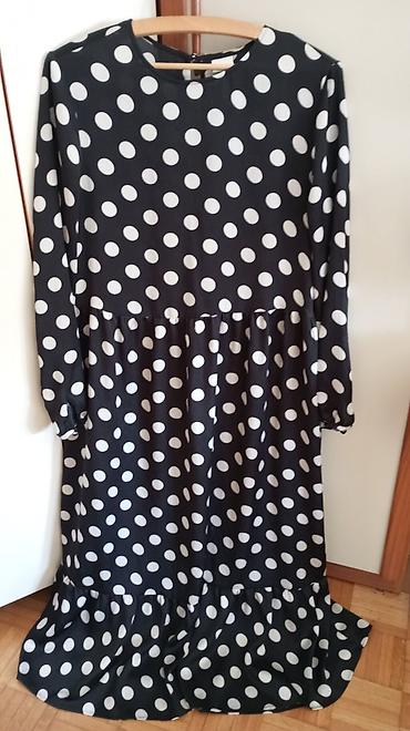 - H&M haljina: crna podloga sa belim tufnama, dug rukav sa blagom gumicom na zglobu, okrugao izrez, dugi kroj sa spuštenim strukom i širokim, naboranim donjim volanom. Zatvaranje pozadi (skriveni rajsferšlus/dugme – prema modelu). Lepršav materijal, prijatan za nošenje, klasičan “polka dot” dezen.