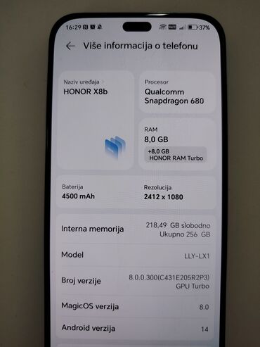 Uređaj ima četvorostruki zadnji kamera modul sa velikim sočivima i HONOR brendingom. Prednja strana sa centralnim izrezom za kameru, tanki okviri. Na fotografijama su vidljivi svi detalji sistema i specifikacija iz menija “Više informacija o telefonu”.