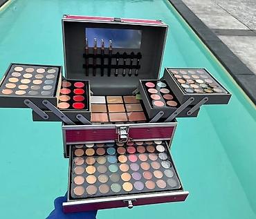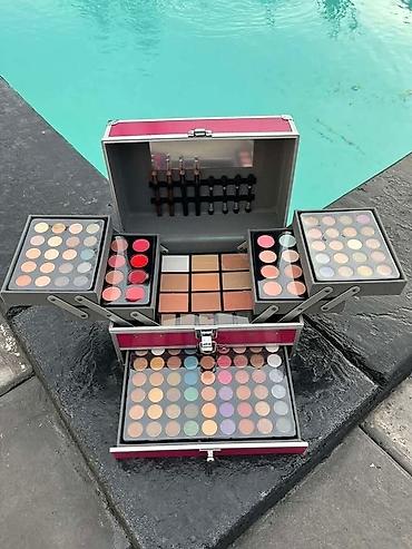 Komplet šminke u okrugloj kutiji sa ogledalom – više nivoa sa izvlačnim paletama. - Sadrži raznovrsne nijanse senki za oči (mat i sedefaste), rumenila i hajlajtera raspoređene u segmentima u obliku...