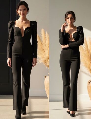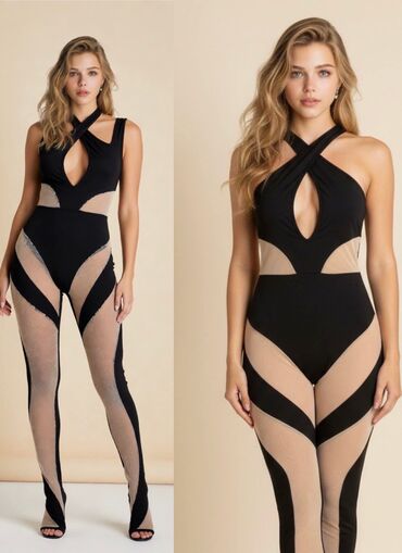 Elegantni ženski kombinezon – crni, dugački rukavi, duboki V izrez. Asimetričan prednji deo sa drapiranim čvorom u struku vizuelno sužava liniju i ističe siluetu. Jedna polovina je ukrašena sjajnim...
