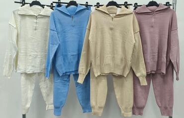 Dvodijelni ženski pleteni komplet – duks i pantalone širokih nogavica. - Materijal: mekani pleteni triko, elastičan i udoban za celodnevno nošenje. - Gornji deo: ravni okrugli izrez, spuštena rame...