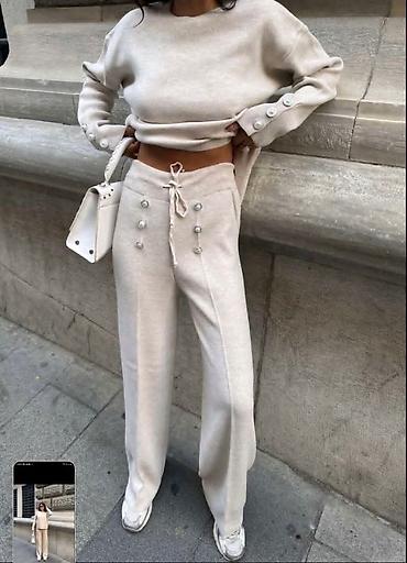 Ženski pleteni komplet – džemper i pantalone u krem/bež boji. - Materijal: mekana, topla pletiva sa vertikalnim reljefnim prugama za produžen siluetu i dodatnu elastičnost. - Gornji deo: opušten k...