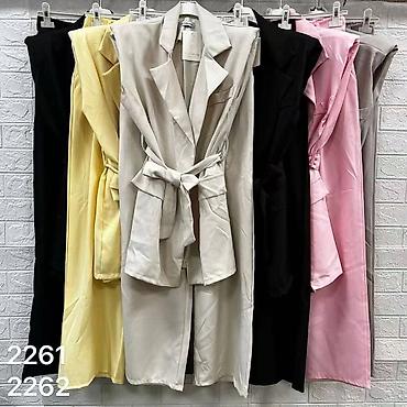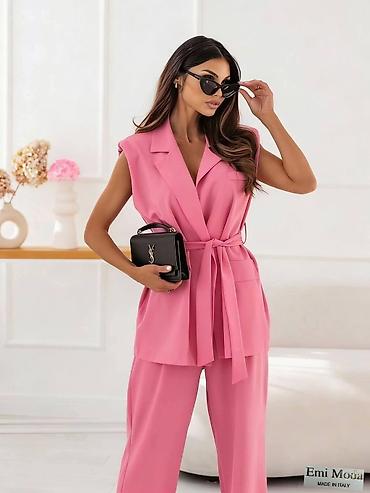 Damski komplet – sako i pantalone - Moderan dvodelni komplet u više boja: bež, crna, roze i svetloplava. - Strukirani sako sa jednim dugmetom, reverima i diskretnim bedžem/etiketom na rukavu. - Pa...
