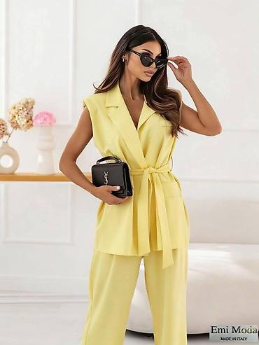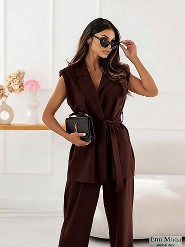 Damski komplet – prsluk i široke pantalone - Kroj: elegantan prsluk bez rukava sa V‑izrezom i formiranim šavovima; pantalone visokog struka sa naborima i širokim nogavicama. - Kopčanje: dekorativn...