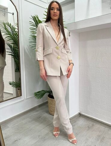 Ženski elegantni komplet (sako + pantalone) za krupnije konfekcije - Kroj: ravne pantalone srednjeg struka i duži sako opuštenog kroja sa jednim dugmetom - Rukavi sakоa: 3/4 dužina - Džepovi: prak...