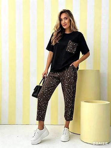 Dvoslojni ženski komplet sa leopard printom - Model: dvodelni set – kratki prsluk/top bez rukava sa polurol-kragnom i kratkim rajsferšlusom + široke pantalone jogger kroja. - Dizajn: dominantan le...
