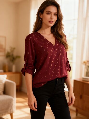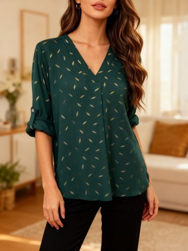 Bela mrežasta/blago providna košulja kratkih rukava sa dezenom pruga i floralnih motiva. Klasičan kragnasti okovratnik od punijeg materijala, kopčanje sprijeda na četiri dugmeta. Blago nabrana zona...
