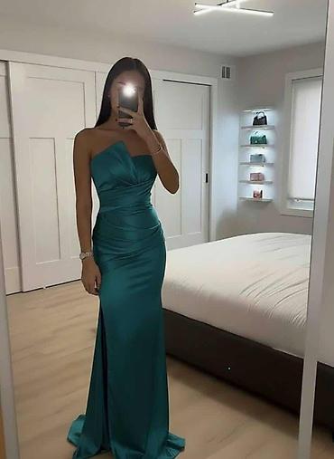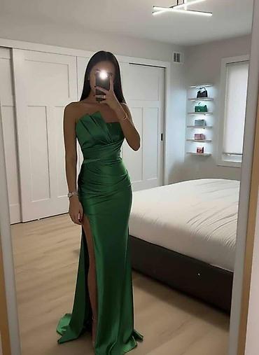 Elegantna večernja haljina – pastelno zelena, bez bretela - Kroj: sirena/usklađena silueta koja naglašava struk i liniju tela, dužina do poda - Izrez: srcoliki korzet bez naramenica, sa diskretnim...