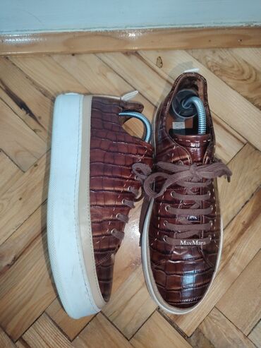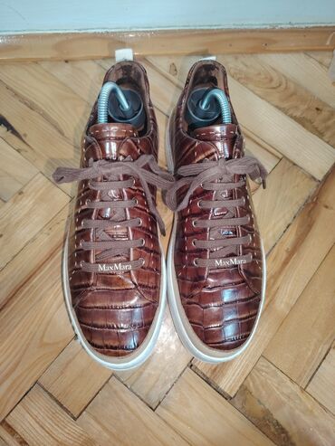 Lakovana kožaMax Mara patike – ženske, niskog profila. UG 25cm. Gornjište od braon lakovane kože sa izraženim krokodil-efekt reljefom. Brendirani metalni logotip „Max Mara” na spoljašnjoj strani obe patike. Okrugle pertle u toniranom braon koloritu, metalne rupice. Udobno podstavljen jezik i okovratnik, kožna unutrašnjost. Deblji gumeni đon u beloj boji sa bež međuprstenom, teksturisana kontaktna površina za bolje prianjanje. Diskretna bela tekstilna petlja na peti za lakše obuvanje. Elegantno-sportski dizajn pogodan za svakodnevno nošenje i kombinovanje.