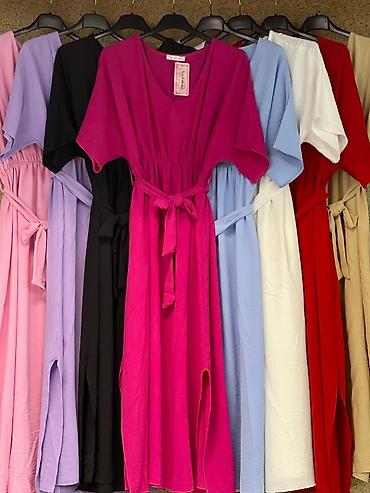 Ženska letnja midi haljina od pamučnog muslina (gauze), ležernog kroja. - Model: preklop V-izrez napred, kratki široki rukavi, elastični struk, bočni prorez za lakše kretanje - Dužina: midi - Mate...