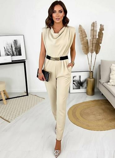 💫💫Elegantni ženski kombinezon bez rukava sa drapiranim (vodopad) izrezom i ravnim nogavicama. Model naglašava struk elastičnim pojasom u crnoj boji sa dekorativnim lančanim detaljem u zlatoj nijans...