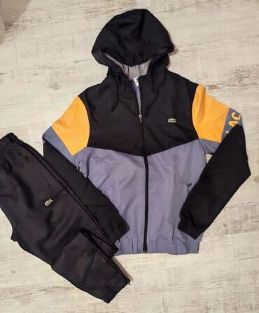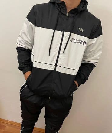 Muška trenerka Lacoste, sa gornjim i donjim delom. Gornji deo je vetrovka sa kapuljačom, crno-bele boje, sa Lacoste logotipom i natpisom na grudima. Donji deo trenerke je crne boje, sa belim prugam...