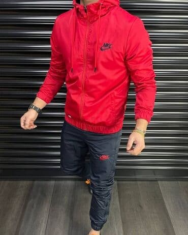 Muška sportska trenerka, koja se sastoji od gornjeg dela u crvenoj boji i donjeg dela u tamnoplavoj boji. Gornji deo je duks sa kapuljačom i patent zatvaračem, dok je donji deo trenerke sa ranflom ...