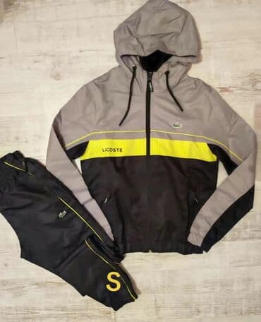 Muška trenerka Lacoste, sa gornjim delom u obliku jakne sa kapuljačom i donjim delom. Gornji deo je u kombinaciji sive, crne i žute boje, sa Lacoste logotipom na grudima i Lacoste natpisom na žutoj...