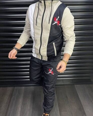 Muška sportska trenerka, komplet koji se sastoji od gornjeg i donjeg dela. Gornji deo je jakna sa kapuljačom, crne, bež i bele boje sa Jordan logom na grudima, dok je donji deo crne boje sa Jordan ...