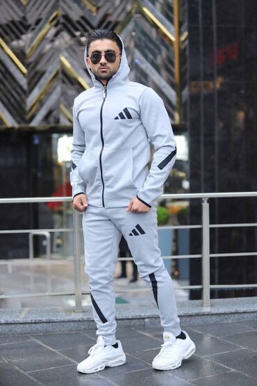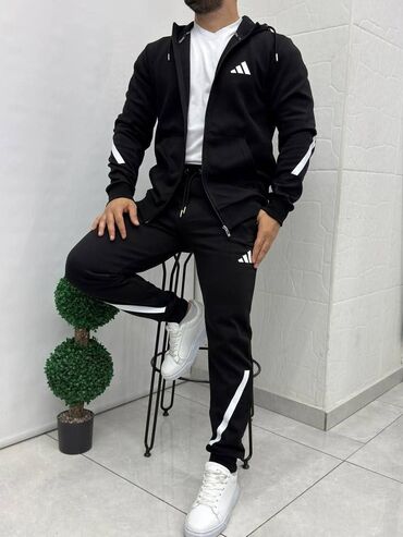 Muški komplet trenerke – gornji deo sa rajsferšlusom i donji deo sa uskim nogavicama - Brend stil: Adidas (logo na grudima i butini, tri pruge duž rukava i nogavica) - Dizajn: sportsko-urbani, sli...